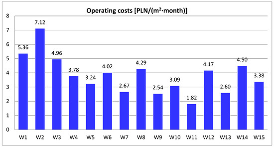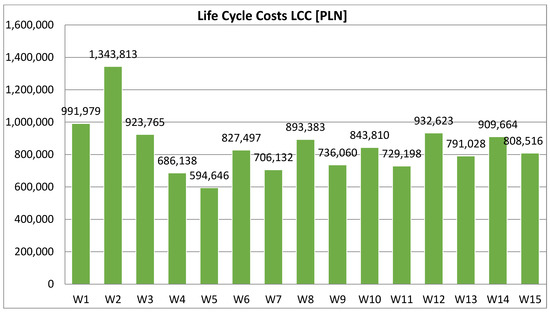 To assess the profitability of individual variants of the heating systems, economic analyses were performed based on the comparison of operating costs, costs of the heating system and LCC costs in the life cycle of the heat and energy source (Scheme 11, Scheme 12 and Scheme 13). High operating costs are typical for a building supplied from a biomass boiler (variant W2), buildings supplied from a hard coal boiler (variant W1) and buildings supplied from a natural gas condensing boiler house (variant W3). The lowest operating costs are in the cases of buildings supplied from highly efficient heat pumps additionally combined with photovoltaic installations (variants W9, W11, W13). From the perspective of the investment costs incurred, the highest costs are generated by heating systems based on renewable, alternative energy sources. The lowest investment costs are, in turn, attributed to heat sources such as heat substations powered from municipal heating plants or cogeneration systems, as well as solid fuel or natural gas boilers. Taking into account the costs in the life cycle of the LCC for 10 years of operation, it follows that the most advantageous solution is the W5 variant based on a heating substation supplied from a heating network from coal-burning cogeneration. However, it does not meet the requirements for PE as stipulated in the technical conditions [13]. Solutions with heat pumps as heat sources combined with photovoltaic PV installations (variants W7, W9, W11) are also economically noteworthy.