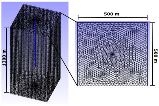 Under initial conditions, a linear geothermal gradient (33.4 °C/km) was established, increasing with depth. This is in line with those values recorded at the wellsite and modelled in the literature (e.g., see [,,,,,]). The surface temperature was set at a fixed constant Dirchlet boundary corresponding to 9 °C and the remaining lateral and basal boundaries were fixed as Neumann no-flow boundaries with heat flux set equal to zero. Under initialisation of the simulation, all wellbore components (grout, pipe, fluid) were set to equal initial conditions (i.e., increase with depth under the natural geothermal gradient). Lateral and basal boundaries of the model were set to extend to a distance where thermal interaction with the DBHE would be minimal (and not occur). For the setup of groundwater flow, a constant Darcy velocity was established in the x direction throughout the model. Finally, the domain size was set at 500 × 500 × 1300 m (x, y, z) (Figure 3).