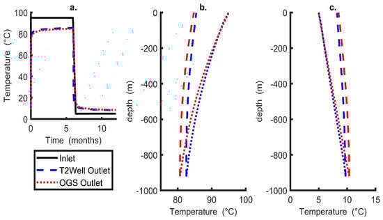 Comparison between OpenGeoSys (OGS) and T2Well-EOS1/TOUGH2 for the initial charge scenario. (a) Inlet and outlet temperatures for the different software, (b) comparison of the vertical profile with depth at the end of charge and (c) comparison of the vertical profile at the end of the extraction period. Note that the dashed line in (b,c) is the central pipe, whilst the dotted line is for the annular space. For the first 6 months of charge a constant inlet temperature of 95 °C was applied and for the subsequent 6 months of discharge an inlet temperature of 5 °C was used.