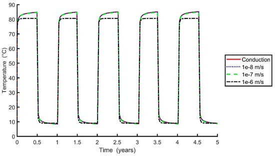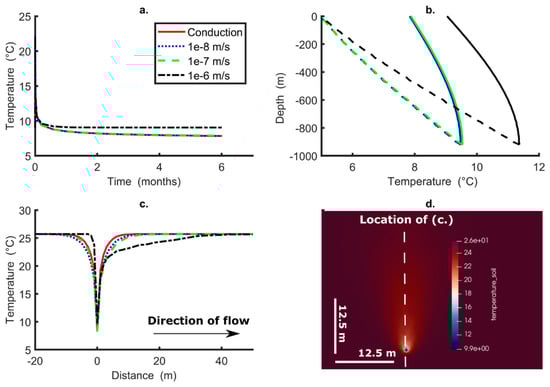 Further parameters tested throughout the study are highlighted in Table 2. The groundwater flow velocity was considered typical in shallow aquifers and is consistent with aquifer values reported in the literature (e.g., [,]). The regional groundwater flux was applied to the Darcy velocity in Equation (1). For context, a Darcy velocity of 1e-7 m/s results from a hydraulic conductivity of 1e-5 m/s (or 0.9 m/d, corresponding to a reasonably clean poorly lithified sand or sandstone aquifer) and a hydraulic gradient of 1% []. It is worth noting that the higher Darcy velocities modelled are more likely to be encountered in shallower settings rather than deep, but were considered in this study as a maximum upper limit of groundwater flow for more universal applications.