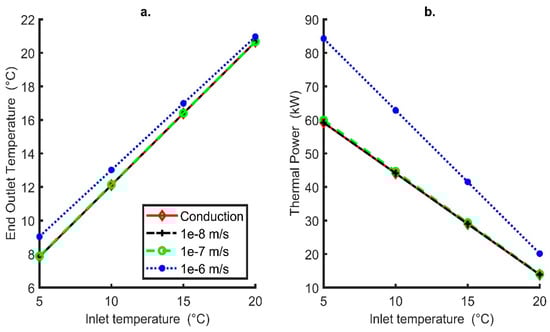 Six-month simulation of heat extraction only from DBHE, with constant inlet temperature and internal fluid flow rate of 5 L/s. (a) shows the impact of varying DBHE constant inlet temperature and groundwater Darcy velocity on DBHE outlet temperature; (b) shows the impact on final thermal output from DBHE after 6 months. Groundwater Darcy velocity is varied between 0 m/s (conduction only) and 1e-6 m/s. Outlet temperatures and thermal powers were recorded at the end of the simulation.