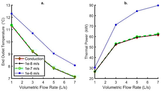 Six-month simulation of heat extraction only from DBHE, with constant inlet temperature of 5 °C and varying the constant heat transfer fluid flow rate. (a) shows the impact of varying DBHE internal fluid flow rate and groundwater Darcy velocity on DBHE outlet temperature; (b) shows the impact on final thermal output from DBHE after 6 months. Groundwater Darcy velocity is varied between 0 (conduction only) and 1e-6 m/s. Outlet temperatures and thermal powers were recorded at the end of the simulation.
