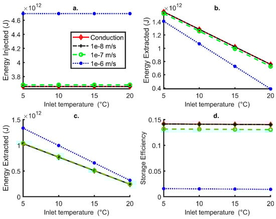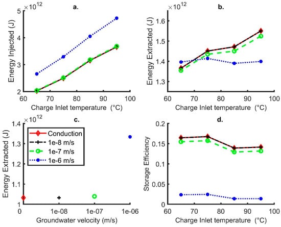 Inlet temperature during charge had a minor negative correlation to the storage efficiency and recovery of heat (Figure 8d). This was due to more heat stored in the formation which cannot be extracted efficiently, particularly with increased groundwater flow. The highest storage efficiency was recorded as 16% when there was no groundwater flow and charge inlet temperature was set at 65 °C, while the poorest storage efficiency was recorded at ~1% for the highest inlet temperatures (85 and 95 °C) and maximum Darcy velocity imposed.