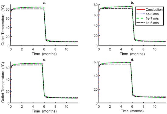 Impact of groundwater Darcy velocity on DBHE outlet temperature for a 6 month charge followed by 6 month discharge period. DBHE internal flow rate = 5 L/s and constant inlet temperature during discharge is 5 °C. (a) is for constant 95 °C inlet temperature, (b) is for 85 °C inlet temperature, (c) is for 75 °C inlet temperature and (d) is for 65 °C inlet temperature.