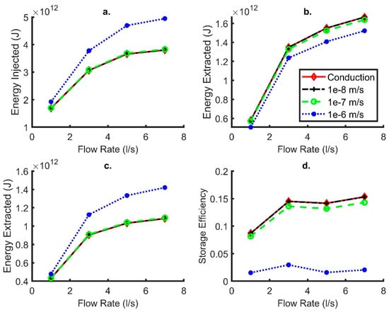 The impact of varying the DBHE internal fluid circulation rate during a 6 month heat charge cycle, followed by a 6 month discharge cycle. Inlet temperature during charge was maintained constant at 95 °C during charge and 5 °C during discharge. (a) energy injected during charge, (b) energy extracted during discharge cycle following charge, (c) energy extracted during 6 month discharge period without preceding charge and (d) storage efficiency calculated according to Equation (10).