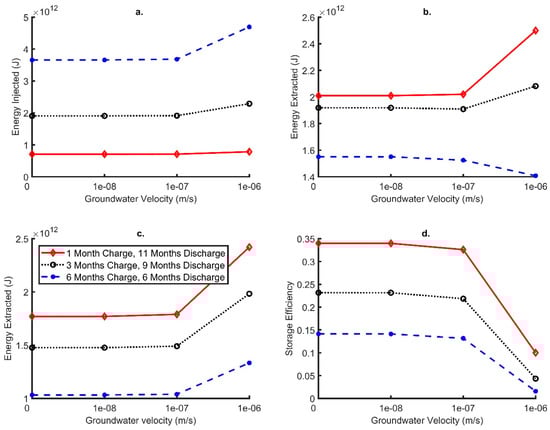 Due to the method of calculating storage efficiency for BTES (i.e., Equation (10)), a period of “extraction only” must be evaluated for each case of thermal energy storage. As highlighted in Figure 5, the influence of groundwater has minimal impact on DBHEs when the Darcy velocity is less than or equal to 1e-7 m/s. When the Darcy velocity significantly exceeds this value (i.e., for 1e-6 m/s), it can be observed that there is a reduction in cooling of the borehole due to asymmetrical thermal drawdown and the cool thermal plume being transported away from the DBHE (Figure 5c,d). At values less than this, the advective transport of heat away from the DBHE by groundwater is minor. With a Darcy velocity of 1e-6 m/s, a thermal plume extends downstream from the DBHE, reaching ~40 m after 6 months, with a width of <10 m. In the absence of groundwater flow, the conductive radius of thermal influence extends to ~9 m from the borehole after 6 months.