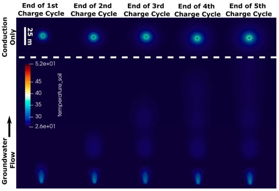 Cross sections in plan view at 500 m depth at the end of the charge period after 5 annual cycles of 6 months charge and discharge. Image shows conductive heat transfer only in the subsurface and with the influence of groundwater flow (Darcy velocity of 1e-6 m/s).
