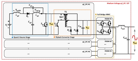 In this section, a new, highly energy-efficient DC–DC/DC–AC stage of SST configuration, which is proposed to manage power flow from a low-voltage DC link to medium-voltage AC grid, is explained. The main motivation of the proposed converter is to provide high-voltage gain in order to makes it possible to reduce the number of series converter cells. The AC–DC stage of the SST is not investigated as it will be low-voltage rectifier topologies. The proposed system is capable of feeding from conventional and new generation low-voltage rectifiers, as well as directly feeding from renewable energy sources or DC microgrids. As illustrated in Figure 1, the proposed converter is composed of three quasi z-source converters, three flyback converters, and a full-bridge modular multilevel converter (FB-MMC) in order to interface 100 V input side and 3.3 kV (peak) medium-voltage grid. The quasi z-source converter is employed to reach high-voltage gain with reduced switch number in comparison with traditional SST topologies. The switches of the quasi z-source converter is triggered considering the gain requirement of the overall system. From a topological perspective, the improved converter integrating the flyback converter switch (Sf) and the Sqz switch form a complementary operation to generate a high-frequency AC voltage on the HFT. The flyback converter is equipped with an IGBT without body diode to prevent the shoot-through current which prevents saturation from reaching the HFT. The proposed qZ_iFC is endowed with an HFT with 1:1:1 turns ratio. Although increasing the turns ratio reduces the core losses due to the low magnetic flux density, it has a drawback in the overall efficiency of the system because it increases the winding losses [29,30]. For this reason, the high-gain capability is provided with the quasi-z-source converter. Thus, the proposed converter is able to achieve high gain while providing galvanic isolation.