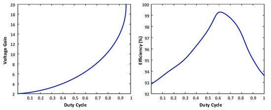 For the designed qz_iFC, the voltage gain can be increased by regulating the duty cycle in order to reach the desired output voltage levels. The characteristics of qZ_iFC topology is examined and the voltage gain/efficiency curve according to the duty cycle is illustrated in Figure 2. The proposed topology provides high-voltage gain values up to 20 and high-efficiency values up to 99.2%. The optimum duty cycle can be maintained between the range of 0.4 and 0.8 considering the most convenient area of efficiency and voltage gain for practical implementations.