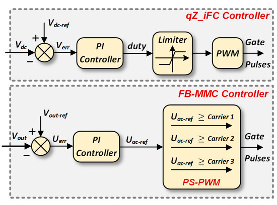 The control scheme of the proposed SST is composed of two different parts including qZ_iFC and inverter controllers as illustrated in Figure 3. The qZ_iFC controller is adopted to adjust the output voltage of the developed qZ_iFC stage by regulating the shoot-through duty cycle of Sqz and the duty cycle of Sf operating in reverse. The controller triggers the switches by complementary duty cycles considering the required output voltage rating. The related controller monitors the DC-link voltage (Vdc) continuously. It compares the difference between the actual and reference values of the DC link. Following the determination of the error value, the computed value is applied to a PI controller. The PI controller produces the duty cycle value for the Sf switch and its complement for the Sqz switch.