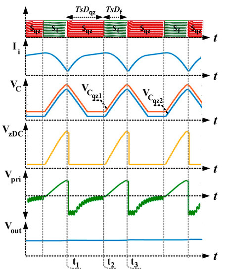The steady-state operation waveforms of qZ_iFC in terms of switching states (Sqz, Sf), input current (Ii), voltages of the quasi z-source converter’s capacitors (Cqz1, Cqz2), and primary voltage of the HFT (Vpri) are presented in detail in Figure 4. As shown in Figure 4, the proposed converter has two operation stages during one switching cycle of Ts. Since the switches of Sqz and Sf operate in a complementary fashion, 1 − Dqz represents the Df.