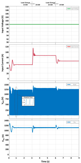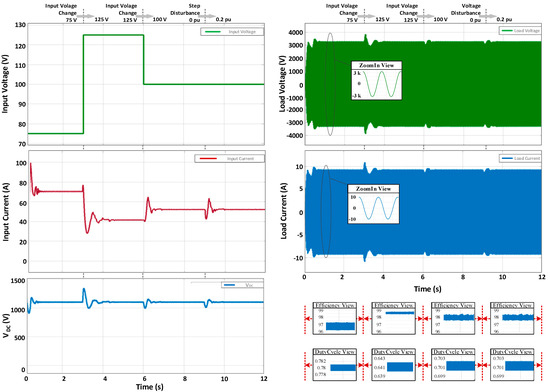 In addition, the presented system was also tested with the case studies of input voltage variations and disturbances under constant load conditions. During the related case, the input voltage variation is designed as follows: Vs = 75 V between 0 and 3 s, Vs = 125 V between 3 and 6 s, and Vs = 100 V between 6 and 9 s. In order to demonstrate the operation performance of the proposed converter, the input/output voltage, current and power waveforms are presented in Figure 7. The Sqz and Sf switches are triggered by the complementary duty cycle values computed by the controller in order to provide constant DC-link voltage for the inverter. As illustrated in Figure 7, the adapted duty cycle values of the Sqz switch are 0.78, 0.64, and 0.70 for states, respectively. The resulting DC-link voltage highlights that the proposed converter is able to keep the DC-link voltage constant during the input voltage variations.