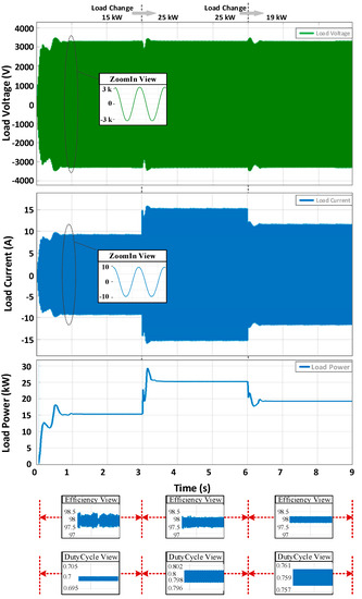 The voltage, current, and power waveforms of load (AC) side are introduced in Figure 6. During the transient and steady-state operations, the output voltage of the proposed SST is kept constant at 3.3 kV peak value. In addition, the current waveform of the load varies in direct proportion to the load change. However, the state detection and reference extraction times cause instantaneous voltage fluctuations at point-of-load variations, the controller smoothly compensates the transient states. During these states, the switches of Sqz and Sf are triggered by the complementary duty cycle values computed by the controller in order to provide constant DC-link voltage for the inverter. As illustrated in Figure 6, the adapted duty cycle values of Sqz switch are 0.698, 0.799, and 0.759 for states, respectively. As understood from the zoom-in view of Figure 6, the total harmonic distortion (THD) of load voltage is about 2.8% and is always kept below voltage harmonic limits of the IEEE 519-1992 standard [30].