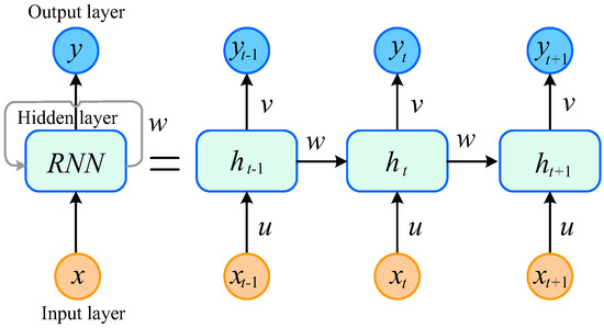 Recurrent neural networks (RNN) were developed in 1986 [35] and are used in handwriting recognition systems. An RNN describes the dynamic behavior of a time series and transmits the state through its own network, so it accepts a wider range of time series inputs. Figure 2 shows the RNN architecture. The relationship between the input and output is expressed as [36]:
