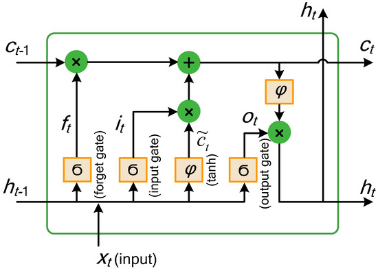 Long short-term memory (LSTM) is a time recurrent neural network that was developed in 1986 [37]. An LSTM is used for processing and predicting important information that features very long intervals and delays in the time series. An LSTM is better suited to longer time series than an RNN. Figure 3 shows the LSTM architecture. The relationship between related nodes is expressed as: