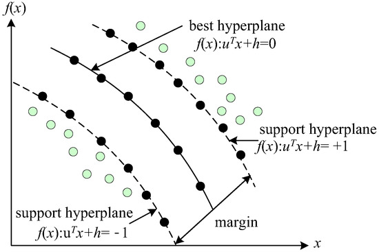 Support Vector Regression (SVR) was proposed by Corter and Vapnik in 1995 [38]. It is used for data classification and regression analysis. An SVR is widely used for image recognition, gene analysis, font recognition, fault diagnosis and load forecasting. Figure 4 shows an SVR hyperplane, which divides the data into high-dimensional spaces, as [39]: