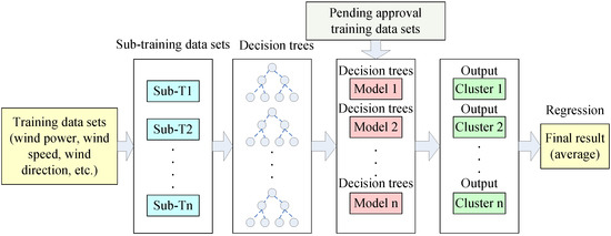 The random forest regression (RFR) model is composed of multiple regression trees. Each decision tree is an independent prediction model that is uncorrelated with other trees. The RFR can be used for discrete and continuous data and can also be used for unsupervised clustering learning and outlier detection. Figure 5 shows a schematic diagram of an RFR algorithm. The steps for an RFR algorithm are described as follows [40]: