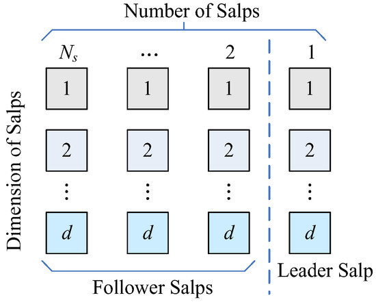 The salp swarm algorithm (SSA) was developed by Mirjalili et al. in 2017 [42]. It simulates the group activities of a salp swarm chain. SSA performs exploration and exploitation during the optimization process. During the foraging process, salps naturally form a group chain structure, as shown in Figure 6, are either leader salp or follower salps. The leader salp swims ahead and guides the whole group forward and updates the swimming direction depending on the position of the food. The other salps are called follower salps, and they update their positions depending on the position of the leader salp. The leader salp updates its position as: