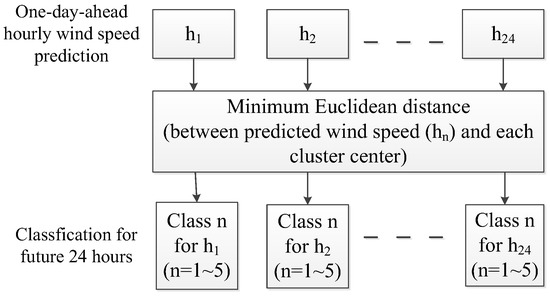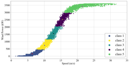 Equation (11) shows that for the minimum Euler distance, n observation data points are divided into k categories. For this study, the wind power data is divided into five categories in terms of the magnitude of the wind.