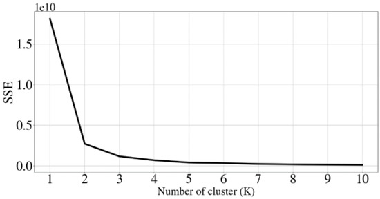 The k-means method was developed by Lloyd in 1987 [33]. It is an unsupervised clustering technique that is mainly used for cluster analysis and data classification. For a set of observation data , the k-means clustering method is used to divide the n observation data points into k categories as: