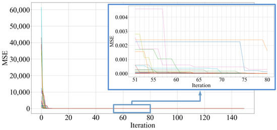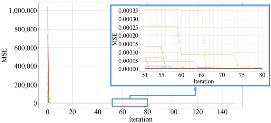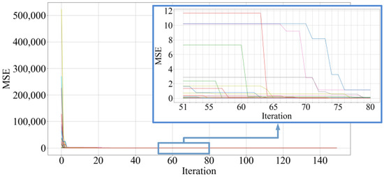 Each plot contains 24 (hourly) optimization curves. In order to easily observe the convergence characteristics, the curves for the 51st to 80th iterations are magnified. The respective convergence average MSE values for PSO, SSA, and WOA are 8.89 × 10−8, 1.10 × 10−10 and 1.53 × 10−6. The convergence time for 24 h for the PSO is 101.08 (s) and the SSA and WOA, respectively, require 113.32 (s) and 134.08 (s) after 150 iterations. Table 8 shows the respective weights for each individual model for the 24 h using the WOA method. A weight of zero signifies a prediction model that has no effect on the output. Similar weight matrices are generated using the PSO and SSA methods.
