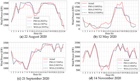 Figure 14 shows the curves for the forecasting results for four different testing days using the PSO, SSA and WOA methods. Table 9 shows the forecasting results for single and ensemble models using the corrected wind speed data. For the 24 test datasets, the respective average MRE value for KNN, RNN, LSTM, SVR, the ensemble-based PSO, SSA, and WOA is 5.8091%, 5.7423%, 5.7622%, 5.7726%, 5.8937%, 5.7403%, 5.7359% and 5.7413%. The optimized ensemble methods give a more accurate forecast than the single models. Table 10 shows the number of maximum and minimum MRE values for single and ensemble models. In terms of the number of maximum MRE, RFR gives a less accurate forecast than the other single and ensemble models. The RNN model and the ensemble models do not produce the worst prediction for all of the test datasets. In terms of the number of minimum MRE values, KNN gives an accurate forecast for seven test datasets; RNN, RFR, and ensemble WOA produce an accurate forecast for three test datasets. Table 11 shows the forecasting results for average MRE using actual data, Solcast forecasting data, Solcast forecasting data with random error, and the forecasting data after correction. If the actual measured wind speed and wind direction are used, the optimized ensemble models give a more accurate forecast than the single models, except for the KNN model. If predicted wind speed and wind direction data that are provided by the Solcast are used, SVR gives a more accurate result than all other models. The optimized ensemble models also allow accurate forecasts.