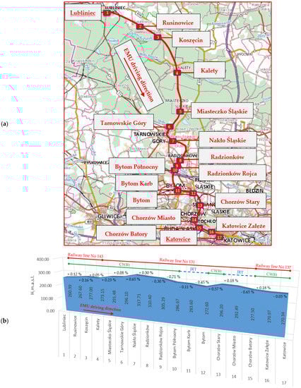 This study covered the complete route from Lubliniec station to Katowice station, located in the Silesian Voivodship in Poland, with a length of 62.741 km (Figure 1 and Figure 2). A total of 17 numbered points representing the stations and passenger stops on the railway lines are represented in Figure 1. The names of the stations and passenger stops in the plane are shown in Figure 1a corresponding to the cartographic development background [64], and the elevation–longitudinal profile, is presented in Figure 1b.