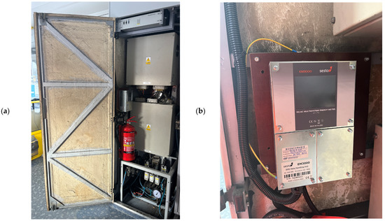 The electricity meter, designation EM3000, was manufactured by Sesto Ltd. (sp. z o.o. in Polish) and is a device commonly used in rail transport to measure, among other things, traction voltage and electricity intake (taken) and donated (fed, put, devoted, returned) into the catenary (Figure 4b). The electricity meter (including the shunt) is of accuracy class 1.1., meets the requirements of the standard PN-EN 50463 [80], and records data on traction energy taken and donated at 5 min intervals. The electricity meter (for both EMUs—EN57AKŚ-223 and EN57AKŚ-730) had current calibration certificates.