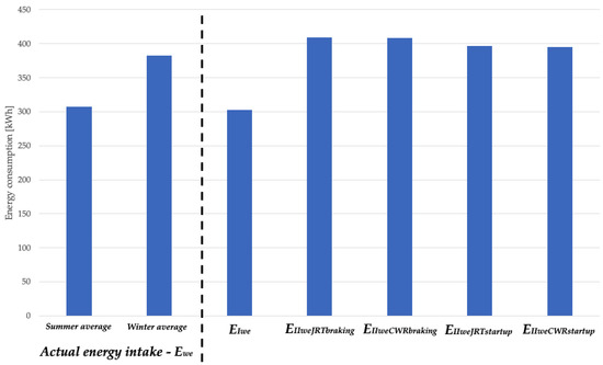 The total specific energy consumption measured at the motor terminals j0CWRt braking was calculated using Equation (2), taking into account the new approach during braking on continuous welded rail tracks for the values of qCWRt braking expressed by Equation (5).