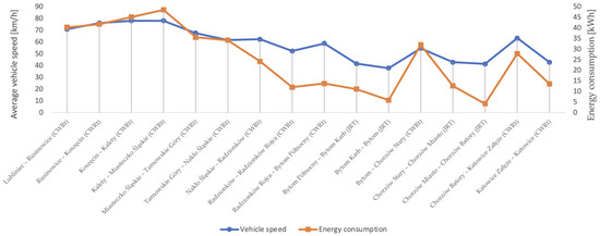 The efficiency of rail transport (rail transportation) is one of the most important pillars of sustainability development systems (SDS). Therefore, the integration of traction electricity (TE) consumption determinants (factor) with the characteristics of route (road) geometry and electric traction vehicles and whole trains (catenary-supplied electric vehicles, non-autonomous electric vehicles, and network traction vehicles, especially electric locomotives and electric multiple units, electric multiple-units (EMU)) is crucial. At the same time, rail transport is one of the most important sectors of the economy, contributing to economic growth. The monitoring of and the correlation between the energy consumption of electric vehicles, their speeds and traffic data, and the geometry of roads was addressed by Morlock et al. [1], Yan et al. [2], Ferreir et al. [3], Karwowski et al. [4], Haładyn [5], and Song et al. [6]. The consumption of traction electricity in rail transport is determined by the factors characterizing the railway lines and the catenary-supplied electric vehicles. These factors have an impact on the vehicles’ driving speeds, on which energy consumption depends. Catenary-supplied electric vehicles are vehicles to which electricity is supplied via the catenary (the overhead contact line). Energy consumption depends on a number of determinants, mainly reflected in the management of traction power supply systems. The problems shaping the subject of factors influencing energy consumption have been addressed in numerous publications [7,8,9,10,11,12,13,14,15,16,17,18,19].