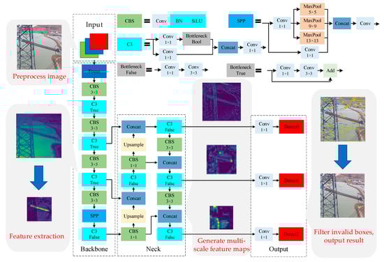 (2) One-stage detection algorithms, such as Single Shot Detector (SDD) [10] and YOLO [11], directly generate the class probabilities and position coordinates of the objects. Among them, [12] adopted improved SDD for insulators and spacers detection. This method used a mobile network to replace the original backbone. It also developed a deep feature pyramid to predict the output of different feature maps. Compared with Faster R-CNN, this method achieved better detection accuracy and faster speed. However, the feature collection capability for small objects was not satisfactory. Study [13] detected insulators using the improved YOLOv3. This method involved an additional spatial pyramid pooling module to merge local and global features. This method improved the detection effectiveness for objects of vastly different sizes. However, it compromised the detection accuracy for insulators within complex backgrounds. Study [14] investigated the detection of major electrical equipment using optimized YOLOv4, which developed a training strategy using CIoU and Generalized Intersection over Union (GIoU), respectively, for large and small objects. However, the classification of large and small objects was relatively not satisfactory in real applications. The authors of [15] simplified YOLOv4 by replacing the backbone network with the MobileNet, which reduced the model’s complexity considerably and promoted its implementation generality on embedded systems. However, the simplification process sacrificed the detection accuracy. Study [16] used YOLOv5s to detect insulators, and added a transformer to the backbone to improve detection performance. The results showed that the detection speed of YOLOv5s is much faster than algorithms such as Faster R-CNN.