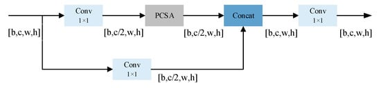 The PCSA block still adopts the structure of C3 module and uses two different 1 × 1 convolution layers to reduce the input feature channels by half for processing, which can deepen the network while reducing the amount of calculation. The structure is shown in Figure 4.