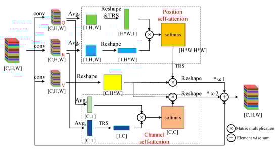 where Q, K, V are the generated feature maps; avgc is the average of the channel dimension; T is transposition; avgs is the average pooling in the spatial dimension; ω1 and ω2 are learnable parameters; and X is the original feature map.