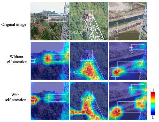 In Figure 6, the different colors of each area represent the different gradients between the current layer and the output layer. Red indicates that the area has a significant impact on the result. With the diminishing color of the area, the importance decreases. In the figure, we manually marked key objects with white boxes. By utilizing the PCSA module, we can see that the color of key objects goes deeper. This indicates that key areas become more distinguished compared to those without the PCSA model, for example, the dampers on the edge of the pictures in the first column, the bird nest in the middle of the pictures in the second column, and the insulator in the upper right of the pictures in the third column. The salience of these key objects has been enhanced, making it easier for the network to detect them. The improvement justified that using the PCSA model could effectively reduce the cases of missed and false detection, and improve the detection ability of objects under complex interference.