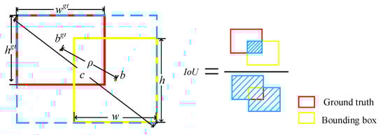 where λ is the enhancement factor, adjusted by experiment; IoU is the intersection over union; areagt is the area of ground truth; b is the center point; ρ is Euclidean distance; c is the diagonal length of the smallest external rectangle of the two boxes; and h and w are the length and width of the box, respectively, as shown in Figure 7.