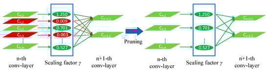According to Equation (6), the output of each channel in the BN layer is positively correlated to the scaling factor γ. If the value of γ is too small or close to 0, the channel output will remain very small and will have little effect on the detection results. At this time, the network complexity can be reduced by removing the convolution layer of its input and the channels of their output, as shown in Figure 8.