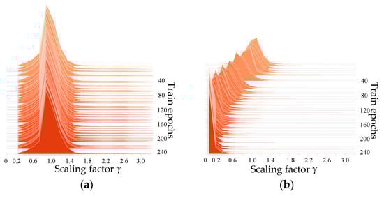 However, under normal conditions, the distribution of scaling factor γ in the BN layer is close to the normal distribution in the training stage, as shown in Figure 9a. This makes it difficult to prune the network. L1 regularization is often used as a penalty term for the loss function in machine learning, which can produce a sparse weight matrix. Therefore, this paper adds the L1 regularization constraint to the γ value in the loss function of the BN layer to make sparse the network model, also known as sparse training, with the loss function as in Equation (7) [28].
