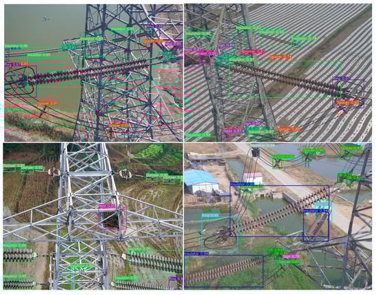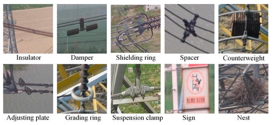 The dataset used in this paper consists of the public dataset of Chinese Power Line Insulators [29] and other real overhead transmission line aerial images, with a total of 1688 images. Most of the pictures were taken on alternating circuit transmission lines. The dataset involves various scenarios such as urban, rural, field, lake, and plain, including insulator, damper, shielding ring, spacer, counterweight, DB adjusting plate, grading ring, suspension clamp, sign, and bird nest, as shown in Figure 10.