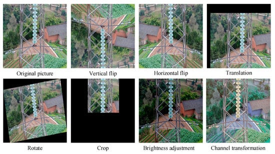 Considering the insufficient number of images in the dataset, data enhancement methods were used to expand the images and improve the network generalizability. The data enhancement methods are shown in Figure 11. Each image needs to be randomly enhanced using two different methods. After data enhancement, 3376 images were generated. Training sets and test sets were divided in an 8:2 ratio.