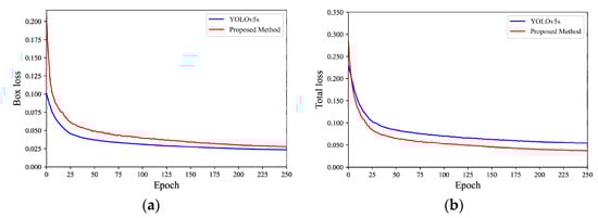 The comparison of the loss curves between YOLOv5s and the proposed method in the training stage is shown in Figure 12.
