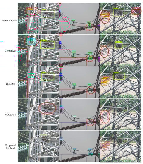 Figure 14 shows comparison studies on images, with the following observations: (1) Faster R-CNN and CenterNet have poor overall detection performance. They are disturbed by the background of the iron tower to cause false detection and cannot accurately detect small-sized adjusting plates and dampers; (2) YOLOv4 has high confidence in the detection of various objects, but it fails to detect the adjustment plates; (3) YOLOv5s fails to detect bird nests in complex backgrounds, as well as small-sized adjusting plates and dampers. Compared with the classic YOLOv5s, the proposed model greatly improves its detection effect on both small objects and objects in complex backgrounds. Therefore, the proposed model is more suitable for transmission line object detection.