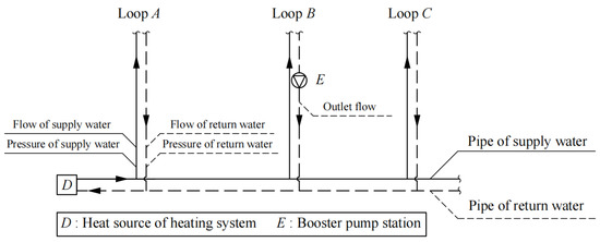 There are three main physical quantities that operate in a heating system: temperature, pressure, and flow rate. The precise regulation of temperature is easier to achieve than the regulation of pressure or flow. The main reason for temperature regulation is a change in building thermal load; therefore, many people construct prediction models based on a building’s energy load or other related time-series data to achieve the goal of improving the accuracy of load prediction. A complete set of temperature regulation logic is then established through high accuracy load prediction [8,9]. Because a heating system has a complex pipe network structure, it is very difficult to accurately analyze the hydraulic state of the pipe network operation; the physical quantities that indicate the hydraulic state of the pipe network are flow and pressure.