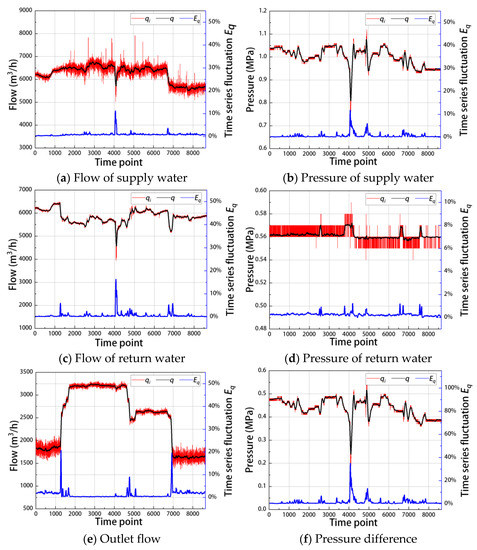 Figure 3 shows the data results obtained by calculating the time-series fluctuation of the heating network data. The red line represents the raw data qi, the black line represents the average value q of the raw data in the observation window, and the blue line represents the time-series fluctuation Eq.