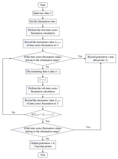 When Eqimax > Eq(i − 1)max, this means that after deleting step data points, the maximum value of the remaining data’s time-series fluctuation value increases, as does the degree of data fluctuation. The value of Nyi should then be recorded, and the elimination calculation should come to an end.