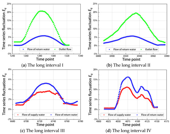 The change patterns with time for the time-series fluctuation value of different traffic data are the same, as shown in Figure 6, indicating that the reasons for the abnormality of different flow data are the same. For example, in the long interval IV, as shown in Figure 6d, the change patterns of the time-series fluctuation values, which record the flow of supply water and return water, are the same, indicating that the reasons for the step data are the same. However, the value of the supply water flow data is greater than that of the return water, and the time-series fluctuation value of the supply water flow data is less than that of the return water, indicating that the greater the data value, the greater the ability to resist data anomalies.