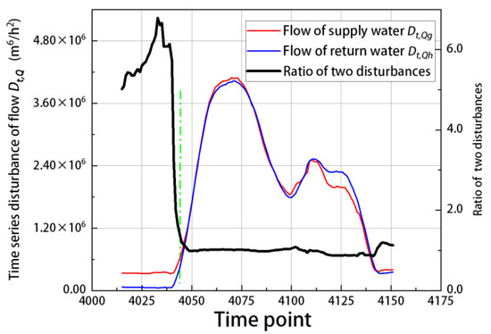 As shown in Figure 8, the left Y axis represents the time-series disturbance of flow and the red and blue lines represent the time-series disturbance of the two, respectively. The right Y axis represents the time-series disturbance ratio and the black line represents the time-series disturbance ratio of the two. The green dash line divides the time interval into two parts. For example, in the time interval [4045, 4151], which is to the right of the green dotted line where the red line and the blue line basically overlap, the time-series disturbance ratio is 0.855~1.200 and the average time-series disturbance ratio is 0.991, indicating that the disturbance is transmitted from the supply water to the return water in loop A. However, in the interval [4015, 4044], which is to the left of the green dotted line, there is a continuous disturbance (non-significant disturbance) in the flow of supply water that is greater than that in the flow of return water. A significant disturbance has not yet formed; thus, the time-series disturbance ratio RQ in this interval does not reflect transmission from the supply pipeline to the return pipeline.