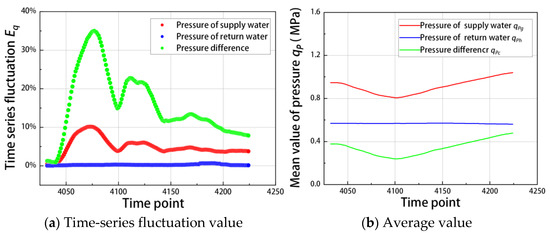 Flow stability Eq is used to measure the stabilization capability of a flow standard device [21,22]. Under experimental conditions, Eq is calculated by continuously obtaining a series of fluid data. The smaller the Eq, the more stable the flow standard device. In fact, the Eq can be understood as the degree of dispersion in a set of fluid data. In this paper, the time-series fluctuation calculation formula is based on stability, as proposed by the ISO standard to measure the stability capability of flow standard devices [23]; accordingly, the calculation method for stability has been validated via the field of flow metering. This paper applies stability to the processing of time-series fluctuation data pertaining to flow and pressure in heating networks, which is among this paper’s innovations.