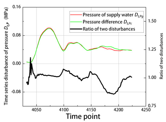 In Figure 10, the left Y axis represents the time-series disturbance of pressure and the red and green lines represent the time-series disturbance of each; the right Y axis represents the time-series disturbance ratio and the black line represents the time-series disturbance ratio of both. Therefore, in the time interval [4032, 4224], where the red line and the green line basically overlap, the time-series disturbance ratio is 0.857~1.180 and the average time-series disturbance ratio is 0.994, indicating that the strong disturbance is transmitted from the supply pipeline to the return pipeline in the loop A.