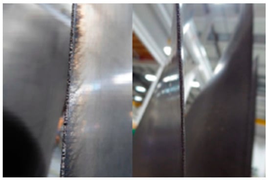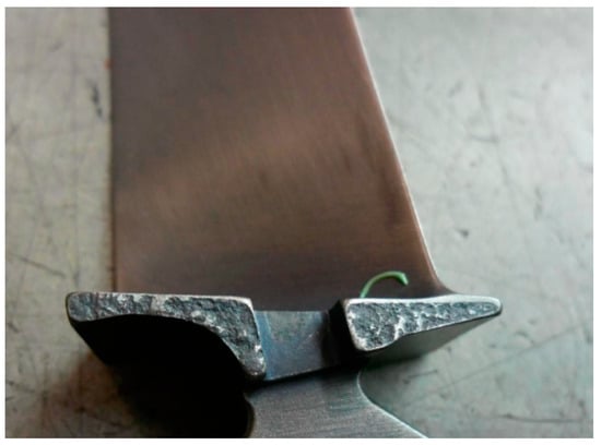 Abrasion is a loss of material due to the rubbing of one surface against another. The removed material typically leads to an increase in seal or tip gaps. Minimizing clearances between blade tips and casing is crucial for reducing the aerodynamic losses that occur in rotating machines, as the overall engine efficiency is negatively impacted by these losses []. In many cases, abradable surfaces are present. In these engines, a certain amount of rubbing is allowed during the run-in of the engine to establish proper clearances []. In [], a study is conducted to investigate the high-speed scraping behavior between a vulcanized silicone rubber and a Ti-6Al-4V fan blade. Blade tip rubbing can occur due to an unbalanced or misaligned rotor due to the shaft bearing damage, engine rotor flexing at heavy operating loads, or the thermal growth of blades []. The result is an increase in blade tip clearance. Another phenomenon that leads to tip rubbing is the engine casing distortion due to flight loads. The principal effect of this is a reductIon in the efficiency of the damaged component [], which results in a drop in engine performance. An example of abrasion on a High-Pressure Compressor (HPC) blade is depicted in Figure 5, taken from [].