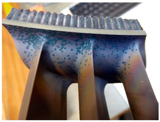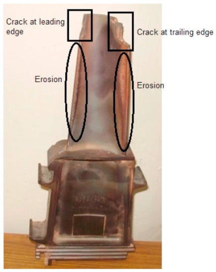 Corrosion is a chemical reaction between some reactive particles contained in the operational flow and the material that constitutes the components encountered in the gas path. “Cold corrosion” refers to the corrosion reaction that occurs in compressor sections, due to wet deposits of salts, acid, and aggressive gases such as chlorine and sulfides. On the other hand, the corrosion occurring in the turbine is known as “hot corrosion,” which is a form of accelerated oxidation caused by molten salts that chemically react with the surfaces of the components on which they rest. Hot corrosion is further dividId into two classes: high-temperature hot corrosion (or type I) that occurs at a temperature range of 730 to 950 °C, and low-temperature hot corrosion (or type II) that occurs at a temperature range of 550 to 730 °C []. More information is available in []. Corrosion is one of the main reasons for blade failure []. A series of examples of aircraft failures due to corrosion are available in [], as well as further information on the phenomenon of corrosion. RD-33 turbofan engine is presented in [], and the effect of corrosion on it is shown. In [], eddy current testing is presented as a means of detecting defects resulting from corrosion around the rivets of supersonic aircraft intakes. As reported in the paper, this type of corrosion is caused by the presence of moisture and salinity in the atmosphere, and eddy current testing is a more suitable technique for detecting deeper defects. Corrosion is a phenomenon that must be carefully monitored, as it can result in significant cost increases. Today, various non-destructive techniques are used to detect ongoing corrosion processes []. Also for corrosion, compressor and turbine blades can be protected by means of adequate coatings []. The effect of corrosion on the compressor is a decrease in efficiency and flow capacity, while on the turbine, corrosion leads to a decrease in efficiency and an increase in flow capacity [], resulting in a decrease in engine performance. In Figure 4, taken from [], are visible the effects of corrosion on an LPT vane.